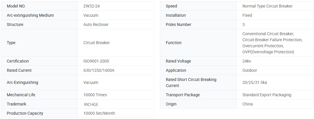 ZW32-24 seriyası Ac 50hz, AC 50hz-də istifadə olunur, 24 kV-lik yükləmə cari, aşırıcı və qısamüddətli cərəyanı bağlamaq üçün 24 kV üç fazalı elektrik sistemi istifadə olunur. Breaker, şəxsiyyətin cari xüsusiyyətlərini müəyyənləşdirmək və birdən çox avtomatik təkrarlanan və ya nöqsan izolyasiyasına nail olmaq üçün təkrarlanan nəzarət cihazı ilə təchiz edə bilər. Öz-özünə təmin edilmiş PT, güc mənbəyi olaraq, Gərginlik və cari, Güclü və cari çıxışı ilə nəzarət edə bilən ağıllı bir dövrə sındırıcı olur.