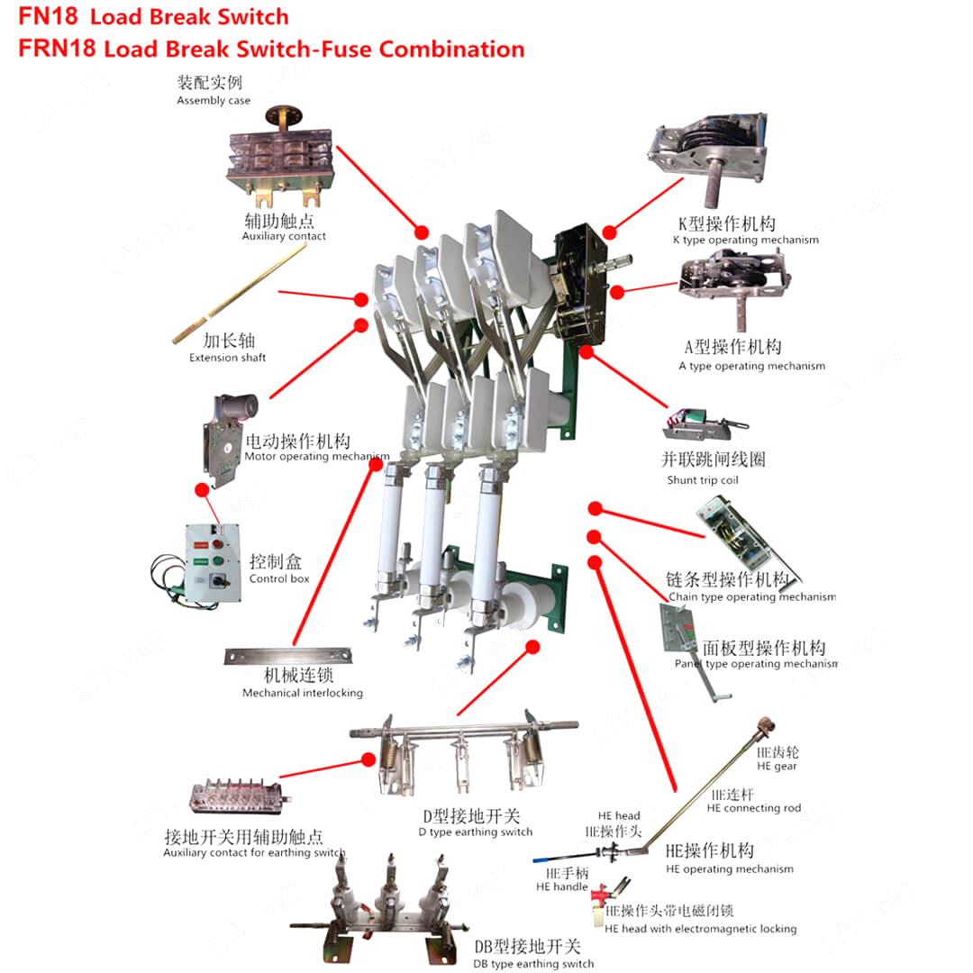 FN18 yük açarları və yükləmə açarları birləşmələri yüksək gərginlikli, yüksək performanslı yük açarları, sıxılmış hava qövsünün söndürülməsi və qaz istehsal olunan qövsü ilə birləşdirən yüksək performanslı yük açarlarıdır. Yük açarı və sigorta birləşməsi, yük açarının reytinqi cərəyanının reytinqli cərəyanına qədər hər hansı bir yükü shortu ilə birləşməsi ilə yük açarının üstünlüklərini birləşdirir və sigorta və onun impinger əməliyyatı yolu ilə birləşmənin qiymətləndirilmiş qısa qapanma cərəyanına qədər hər hansı bir aşırı dəyişdirmək.
