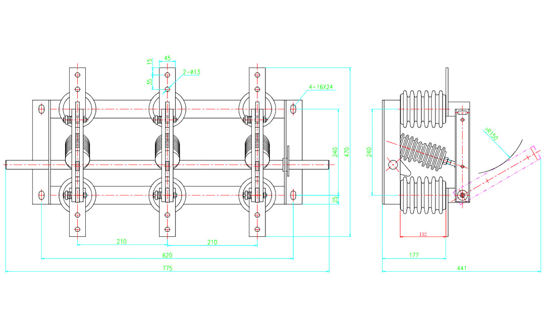 GN19-12 / 400, 630, 630, 1000, 1250 tipli bir keçidin keçirici hissəsi hər bir mərhələ üçün iki dirək izolyatoru tərəfindən qurulur. (GN19-12c / 400, 630, 1000, 1250 tipi bir sütun izolyatoru və bir çini bir qutu izolyatoru var.) Paralel olaraq üç mərhələ quraşdırılıb və kontakt bıçaqlarının (və ya keçirici çubuqların statik kontaktlarından ibarətdir. Əlaqə bıçağının hər bir mərhələsi qalstuk izolyatorunun ortasına, tie izolyatoru bağlayır və qoşulmuş mili bazasına quraşdırılmışdır. Mili bağlayıcı çubuğu (istifadəçi tərəfindən təmin edilmiş) və CS6-1 sapı ilə hərəkət mexanizmi ilə bağlıdır. Birləşdirici əlaqə bıçağı, alt temperaturu aşağı salmaq üçün, həm də əlaqə bıçağının mexaniki gücünü artıran, həm də əlaqə bıçağının mexaniki gücünü artıran, həm də əlaqə bıçağının mexaniki gücünü artırır, beləliklə, keçidin dinamik sabitliyi yaxşılaşdırıldı. Əlaqə bıçağının bir ucu bir bolt (və ya keçirici çubuğu) bir bolt (və ya shaw) tərəfindən quraşdırılmışdır. GN19-12 / 1000, 1250 Maqnit kilidləmə plakasının quraşdırılması ilə əlaqə qurarkən, üstəgəl maqnit kilidləmə plakasının məqsədi, böyük bir qapanma, iki yivin arasında təmas bıçağını artırmaqdır Cazibə. GN19-12 / 400, 630 ayırın açarları cari ilə kiçik bir məhdudiyyətə malikdir, buna görə maqnit kilidləmə boşqab əlavə etməyə ehtiyac yoxdur.