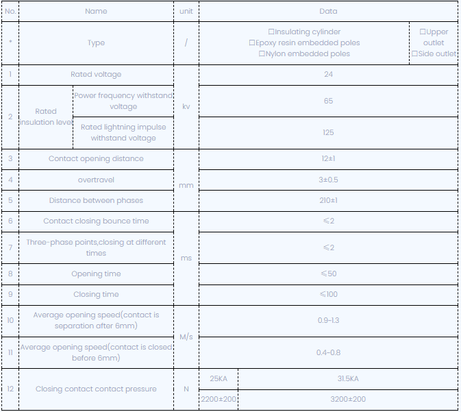VBI-24 tərəfi quraşdırılmış tipli tipli vakuum çəngəlinin istismar mexanizmi, iki yolla, dərslik və ya elektrik enerjisi ilə işlənə bilən bahar istifadə olunur. Xüsusiyyətlər GB1984-89, JB3855-96-a uyğundur<10kv Indoor High Voltage Vacuum Circuit Breaker General Technical Specifications>, IEC56 standartının müvafiq müddəaları.
