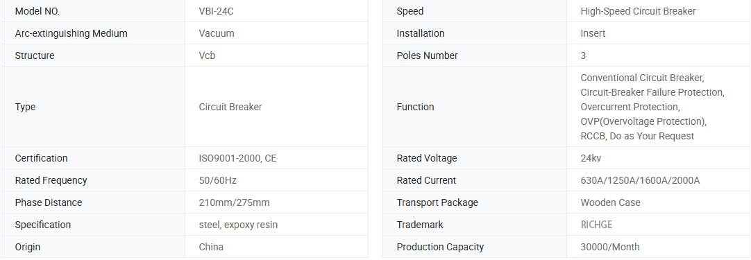 VBI-24 Orta Vaxtı Vakuum Dövrə Breaker, İsveçrədə ABB korporasiyası texnologiyasını birləşdirən və Çində inkişaf etdirilən 50Hz / 60Hz üç faza AC 24KV qiymətləndirilmiş gərginlikli bir növ orta gərginlikli bir cihazdır. Məhsul standart GB1984 və IEC62271-100 ilə uyğun gəlir.