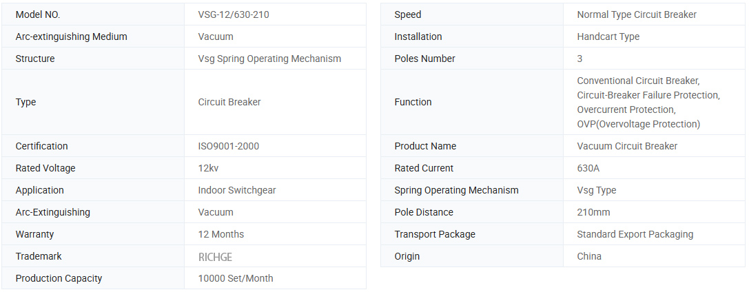 VSG-12 qapalı yüksək gərginlikli vakuum dövrə açarı (ABBR .: Circuit Breaker), qiymətləndirilən gərginlik 12 kV-lik 50hz elektrik təchizatı paylanmasıdır. Bu məhsul GB1984-2003 (yüksək gərginlikli A.C. Circuit Breaker), JB3855-1996 (3.6-4.5kv qapalı A.C. Yüksək gərginlikli dövrə açarı), DL403-2000 (12-40.5 kv yüksək gərginlikli vakuum dövrə açarı) və IEC standartı 62271-100: 2001 (yüksək səviyyədə) A.C. Circuit Breaker). Grid avadanlıqlarında və sənaye və mədən müəssisəsinin dinamik dizaynında avadanlıqların qorunması və idarə olunması üçün istifadə edilə bilər .Bu, müxtəlif əmlakla və tez-tez baş verən tez-tez işləməsi üçün və qısa dövrə cərəyanının qırılması ilə tez-tez işləməsi üçün uyğundur.